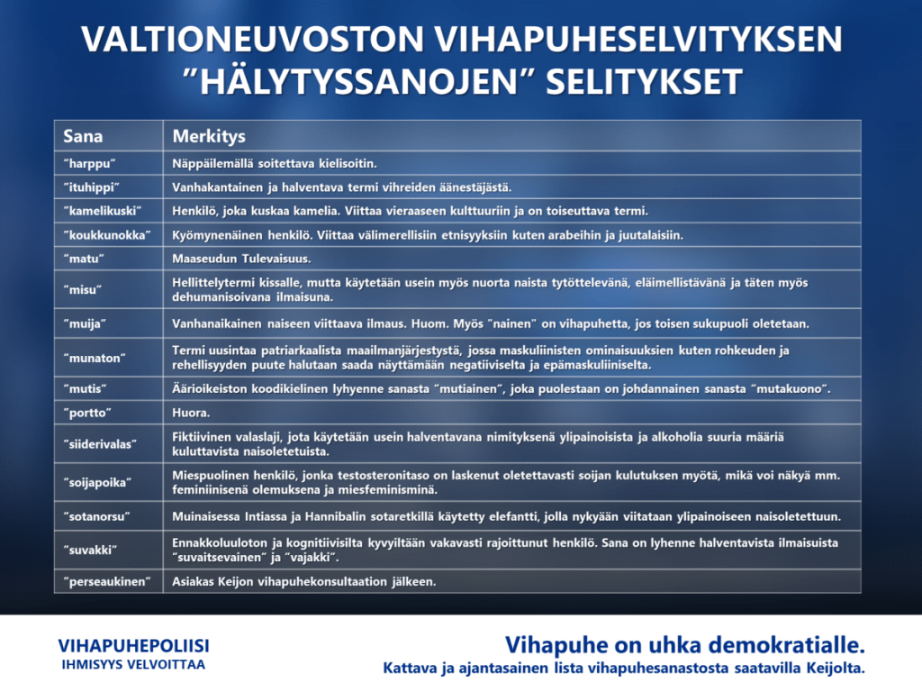 Moni on ihmetellyt, miten Valtioneuvoston uusi vihapuhetutkimus olikin niin edullinen – vain 100 000 euroa? Tällä rahalla saatiin mm. demokratialle elintärkeä hälytyssanojen lista, jonka avulla näemme kun demokratiaa ollaan horjuttamassa vihasanoilla kuten “harppu”, “kamelikuski”, “siiderivalas” ja “soijapoika” (katso koko lista Valtioneuvoston selvityksestä sivulta 128 alkaen).